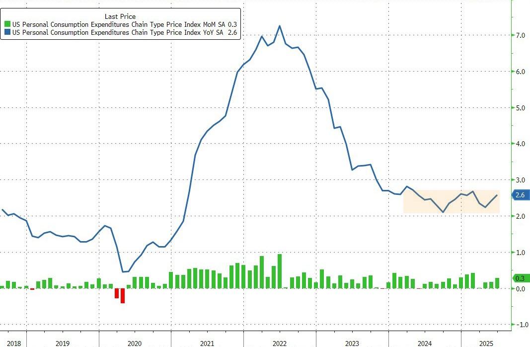 具体数据显示,美国6月整体PCE物价指数同比上涨2.6%,高于预期的2.5%,前值上修0.1个百分点至2.3%。环比上涨0.3%符合预期,前值从0.1%上修至0.2%。